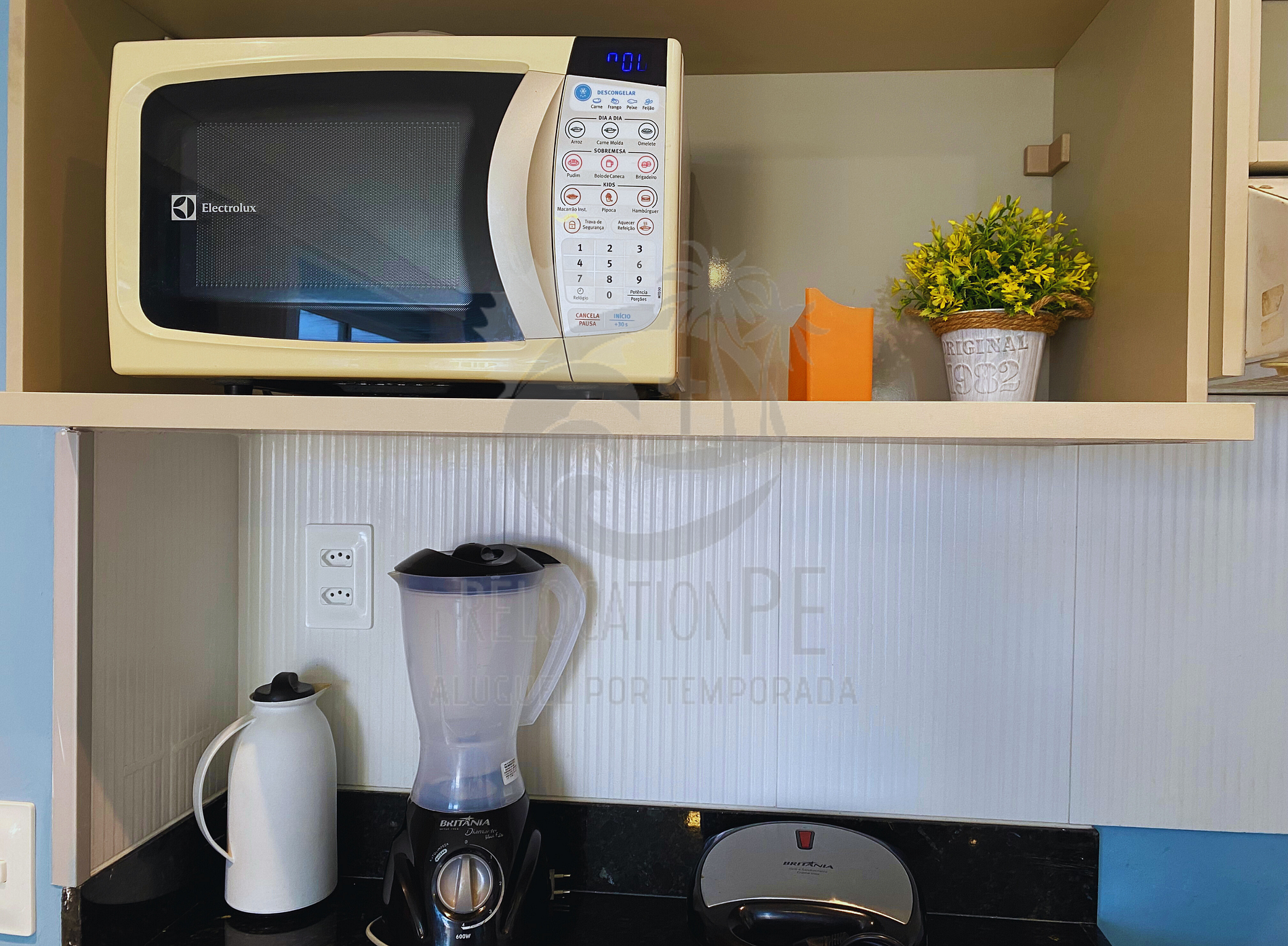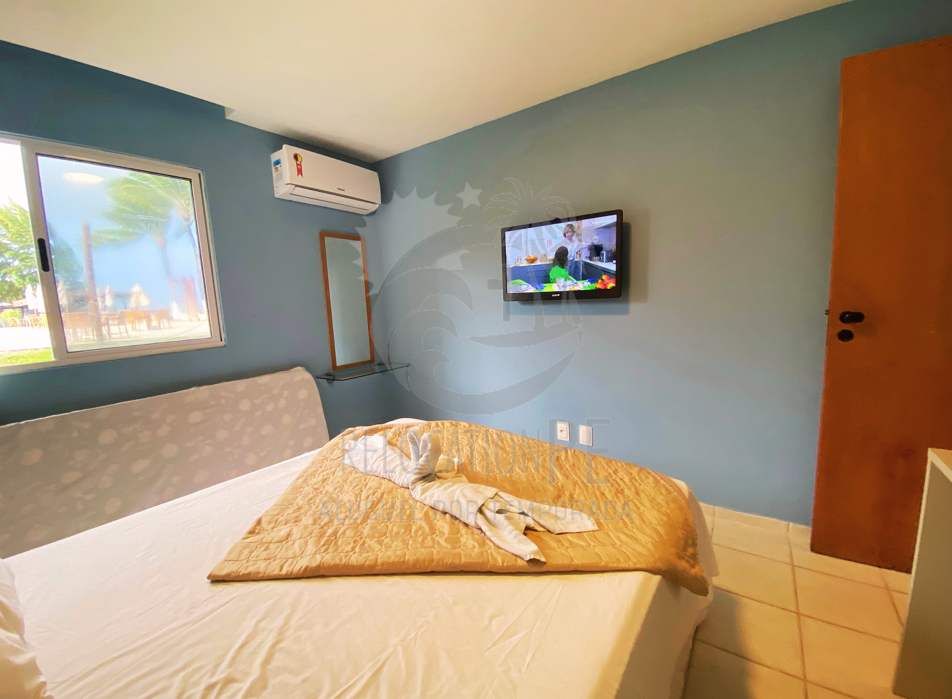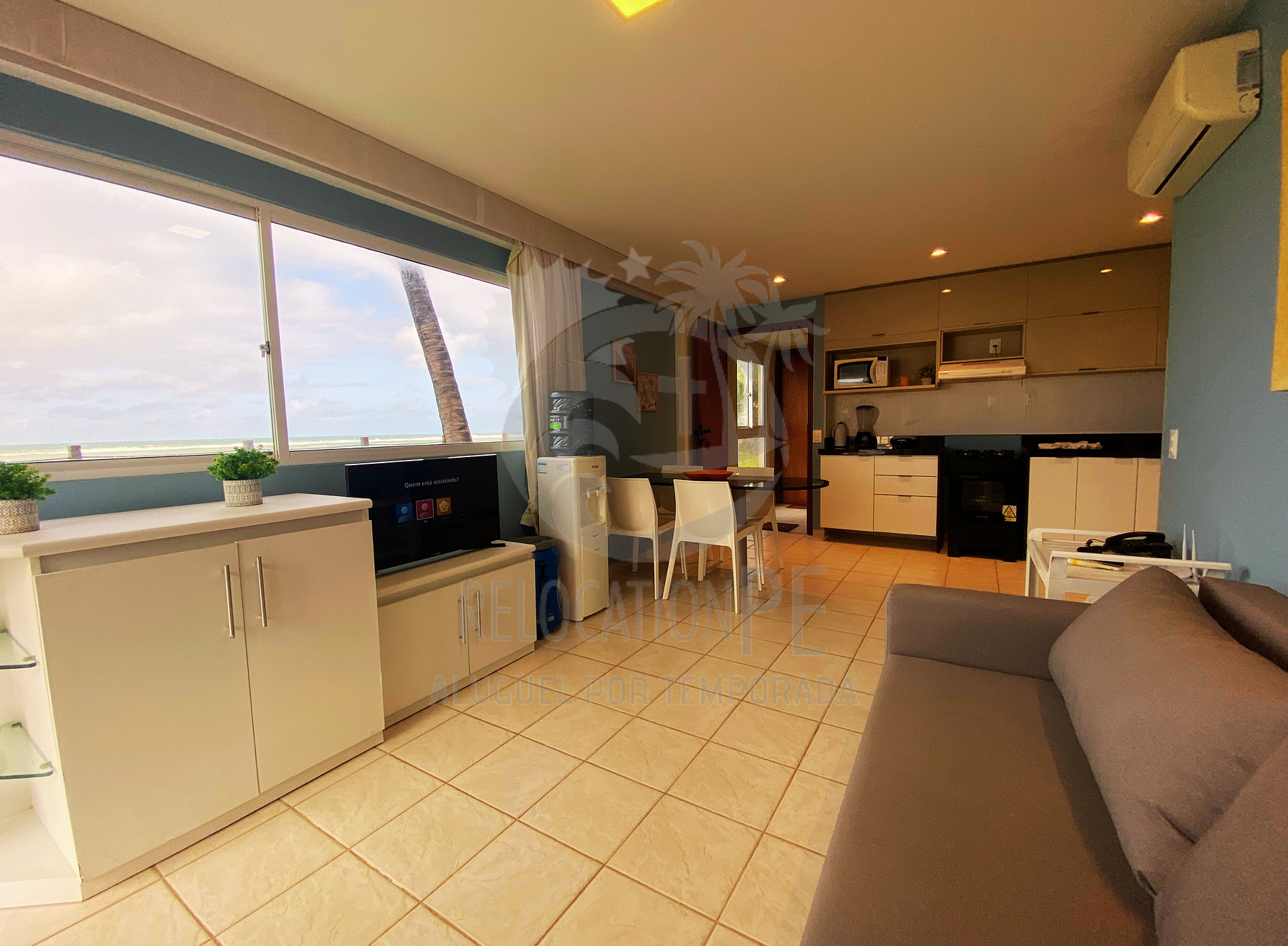 > Apartment Features: - Large living room, furnished and decorated with double sofa bed + 1 single sofa bed, with 42-inch Smart TV, 12 thousand BTUS split air conditioning; - Balcony by the sea - privileged location; - 1 bedroom with Queen Size bed + single mattress, 28-inch LED TV and 9000BTUS air conditioning - Bathroom with blindex + hot/cold shower; - Full kitchen with all utensils, stove, refrigerator, small appliances (AirFryer, sandwich maker, blender, microwave).