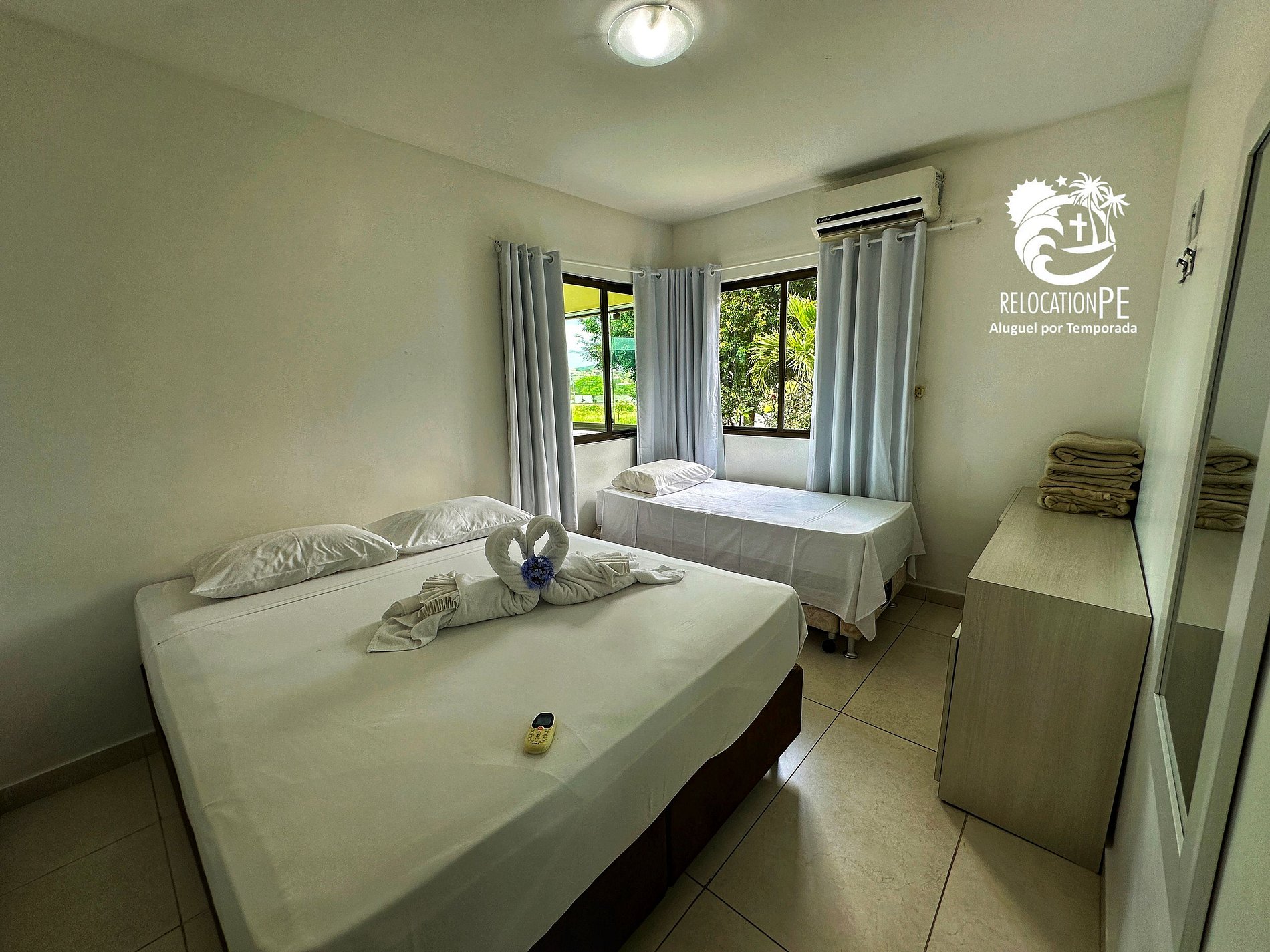 - Suite 2: Bedroom with 2 single beds and 1 pull-out bed, closets and air conditioning for your comfort, bathroom with hot shower;