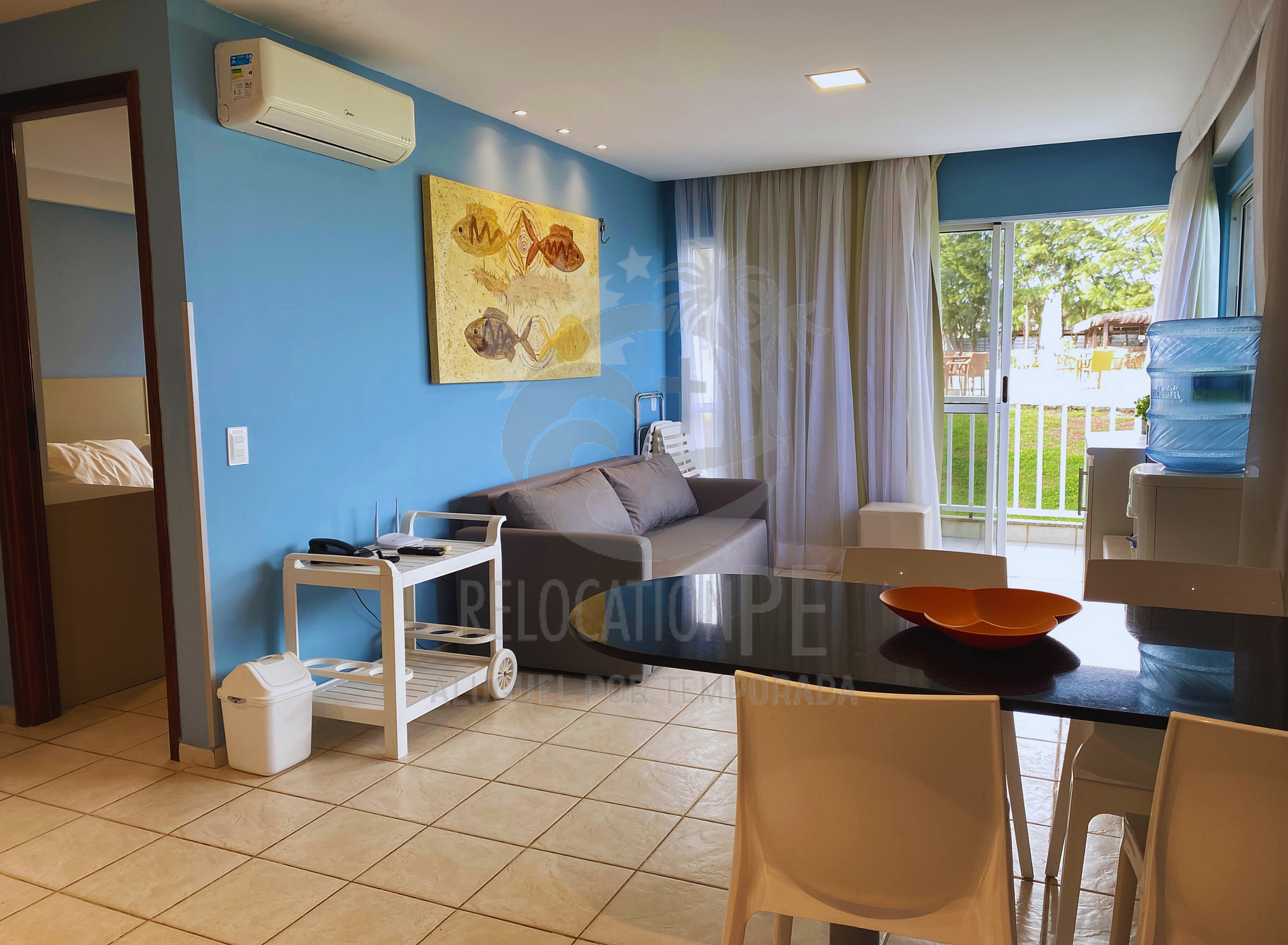 - Amplio salón, amueblado y decorado con sofá cama doble + 1 sofá cama individual, con Smart TV de 42 pulgadas, aire acondicionado split de 12 mil BTUS;