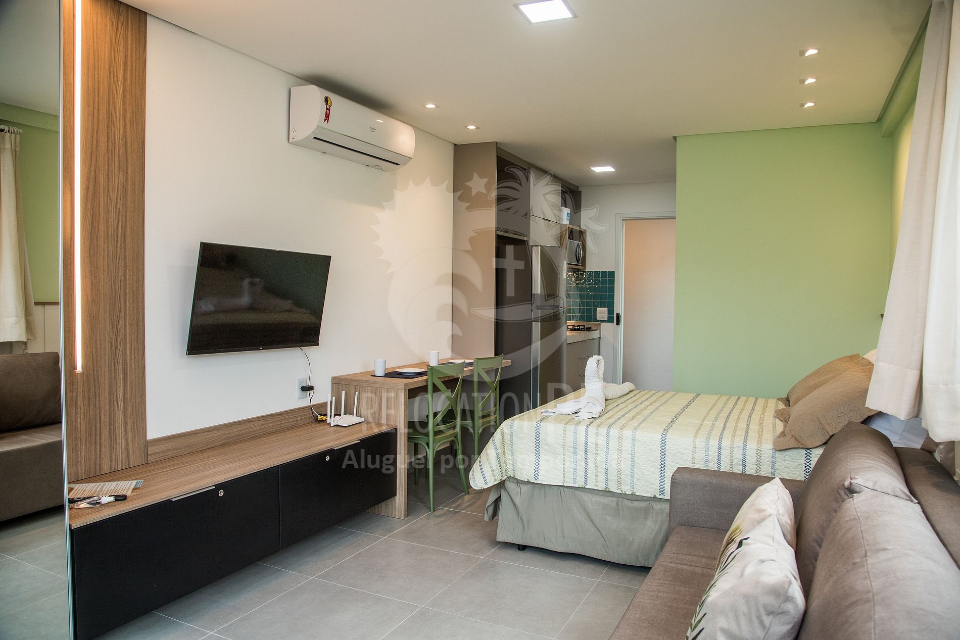 - 01 dormitorio/sala de estar con capacidad para hasta 04 personas, con cama doble (colchón de muelles ensacados) y sofá cama (espuma ortopédica), SMART TV, aire acondicionado split y cortina blackout;