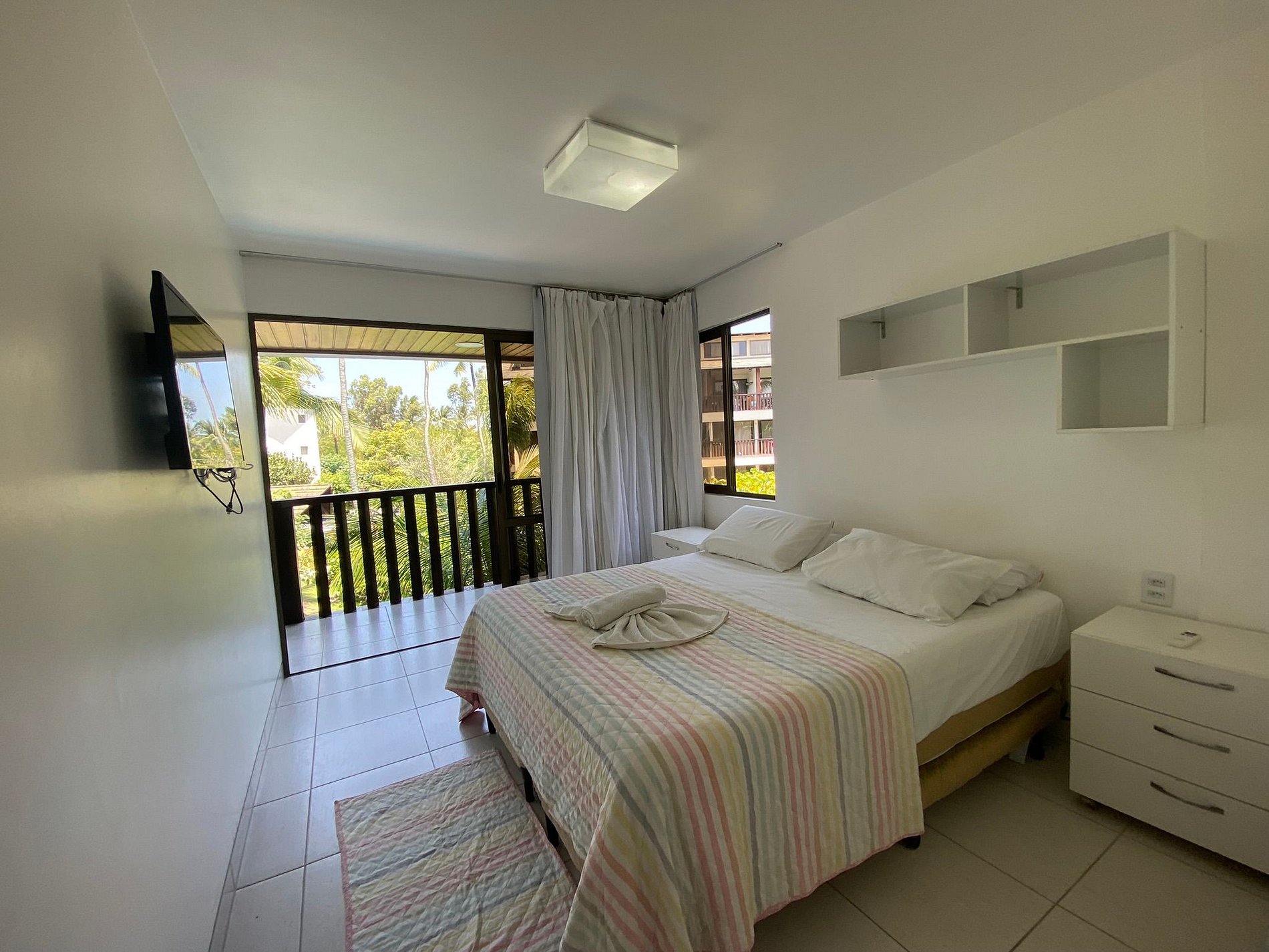 - 1 suíte com varanda e vista da piscina e do mar com cama Queen Size, com duas camas auxiliares (comporta até 4 pessoas), TV, e ar-condicionado split.