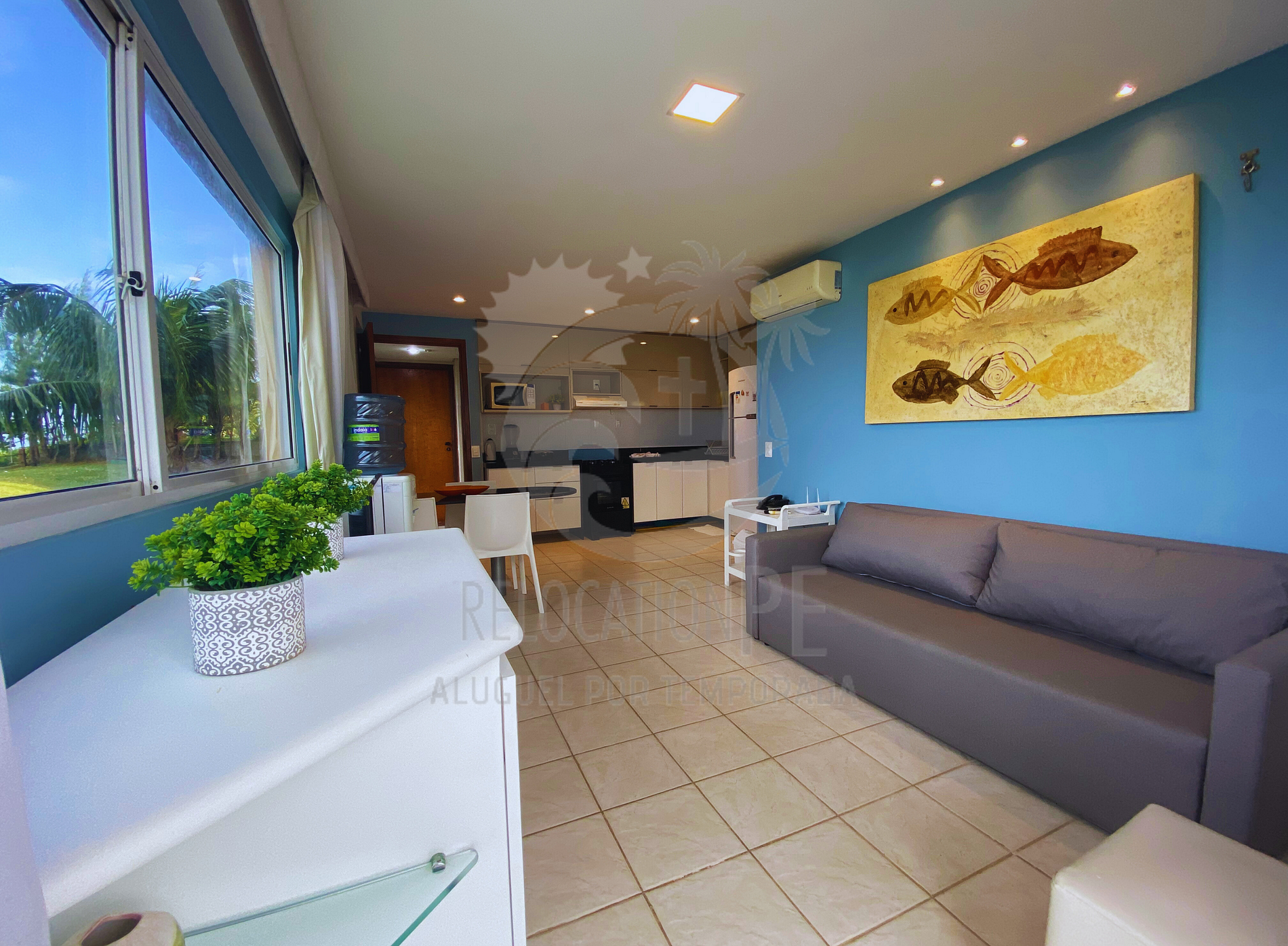- Sala ampla, mobiliada e decorada com sofá-cama casal + 1 sofá-cama solteiro, com Smart TV 42 polegadas, Ar-condicionado Split 12 mil BTUS;