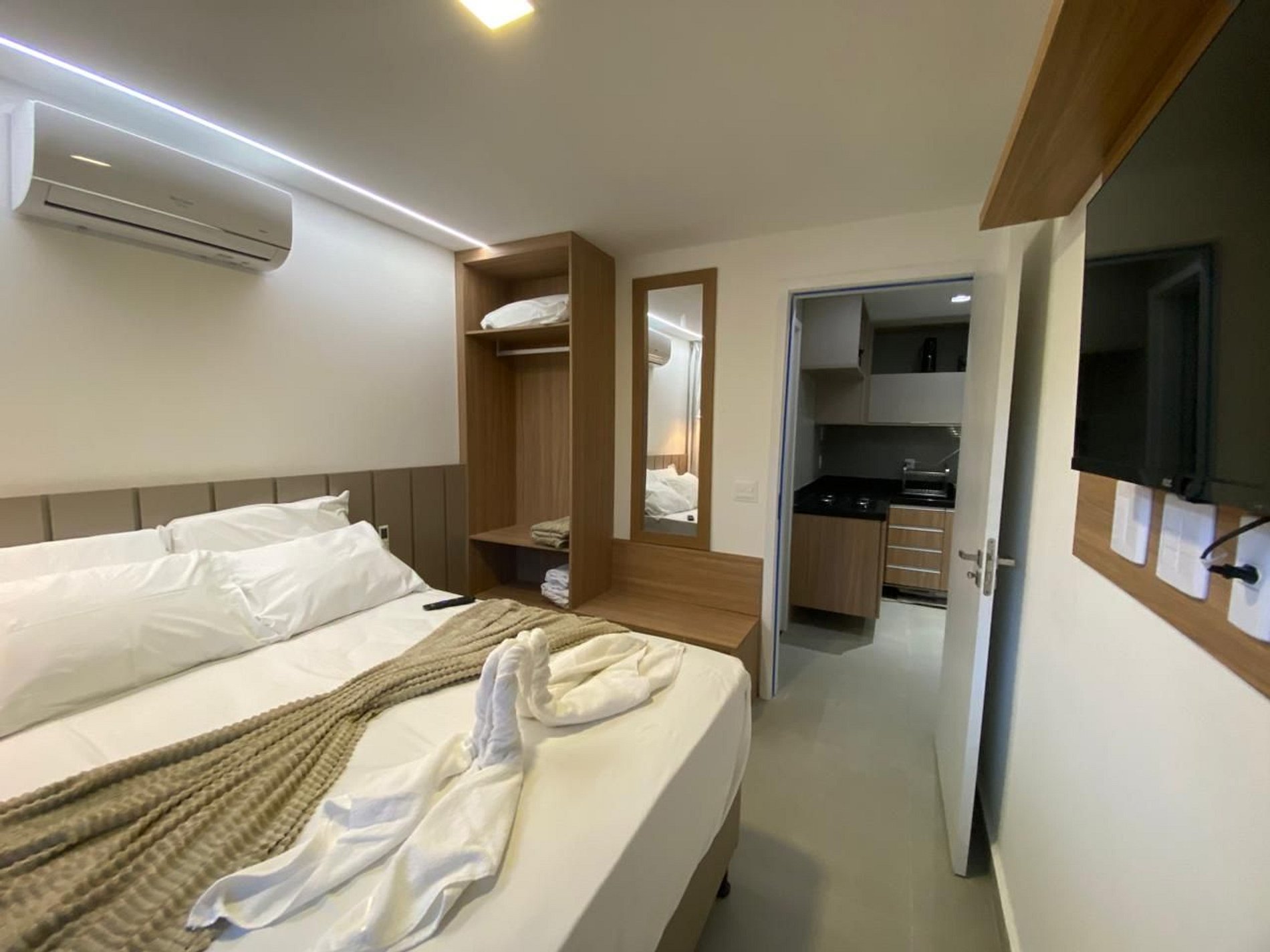 - Quarto com cama de casal + colchão solteiro, TV SMART, ar-condicionado split e cortina blackout;